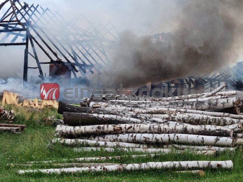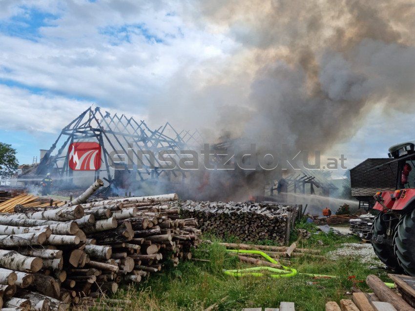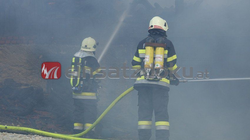 Zu einem Großbrand ist es am Montagnachmittag (05.07.2021) in Baumgarten (Gemeinde Pinggau) gekommen. In Rosenbichl ist aus noch unbekannter Ursache ein Wirtschaftsgebäude in Brand geraten. Die anfahrenden Kräfte der insgesamt 10 Feuerwehren aus der Steiermark und Niederösterreich konnten die Rauchsäule bereits von Weitem sehen. Beim Eintreffen der ersten Feuerwehren stand das Wirtschafts- sowie Stallgebäude bereits in Vollbrand. Aufgrund der Löschwasserknappheit am Einsatzort wurde neben dem Tankwagenpendelverkehr eine Zubringleitung mit insgesamt 47 B-Schläuchen gelegt. Um den Förderdruck aufrecht zu halten, mussten 7 Tragkraftspritzen (TS) eingebaut werden. Ein Übergreifen auf das Wohnhaus konnte verhindert werden. Alle im Stall befindlichen Rinder konnten gerettet werden. Arbeitsmaschinen, Heu und Stroh vielen dem Feuer allerdings zum Opfer. Die umfangreichen Nachlöscharbeiten dauerten bis in die Nachtstunden an. Ein Kran der FF Pöllau unterstützte die örtlichen Einsatzkräfte beim Zerteilen des Brandgutes. Die Brandursache ist unbekannt und wird von der Polizei ermittelt. Insgesamt standen 10 Feuerwehren aus der STMK und NÖ mit rund 170 Mitgliedern im Einsatz.
