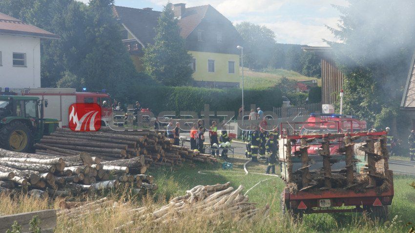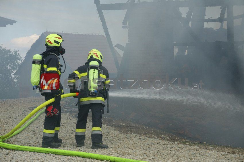 Zu einem Großbrand ist es am Montagnachmittag (05.07.2021) in Baumgarten (Gemeinde Pinggau) gekommen. In Rosenbichl ist aus noch unbekannter Ursache ein Wirtschaftsgebäude in Brand geraten. Die anfahrenden Kräfte der insgesamt 10 Feuerwehren aus der Steiermark und Niederösterreich konnten die Rauchsäule bereits von Weitem sehen. Beim Eintreffen der ersten Feuerwehren stand das Wirtschafts- sowie Stallgebäude bereits in Vollbrand. Aufgrund der Löschwasserknappheit am Einsatzort wurde neben dem Tankwagenpendelverkehr eine Zubringleitung mit insgesamt 47 B-Schläuchen gelegt. Um den Förderdruck aufrecht zu halten, mussten 7 Tragkraftspritzen (TS) eingebaut werden. Ein Übergreifen auf das Wohnhaus konnte verhindert werden. Alle im Stall befindlichen Rinder konnten gerettet werden. Arbeitsmaschinen, Heu und Stroh vielen dem Feuer allerdings zum Opfer. Die umfangreichen Nachlöscharbeiten dauerten bis in die Nachtstunden an. Ein Kran der FF Pöllau unterstützte die örtlichen Einsatzkräfte beim Zerteilen des Brandgutes. Die Brandursache ist unbekannt und wird von der Polizei ermittelt. Insgesamt standen 10 Feuerwehren aus der STMK und NÖ mit rund 170 Mitgliedern im Einsatz.