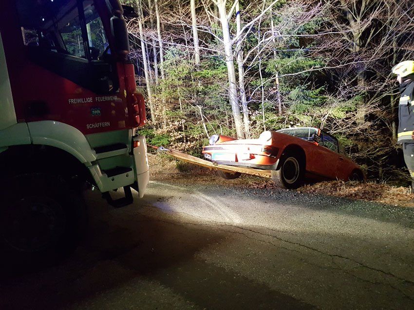 Der Porschefahrer hatte Glück im Unglück und blieb bei dem Unfall unverletzt. Der PKW wurde zunächst gegen ein weiteres Abrutschen gesichert und anschließend mittels Seilwinde des TLF-A 3000 geborgen.
