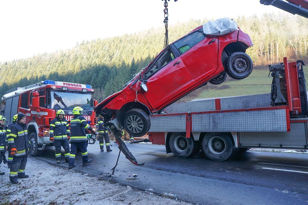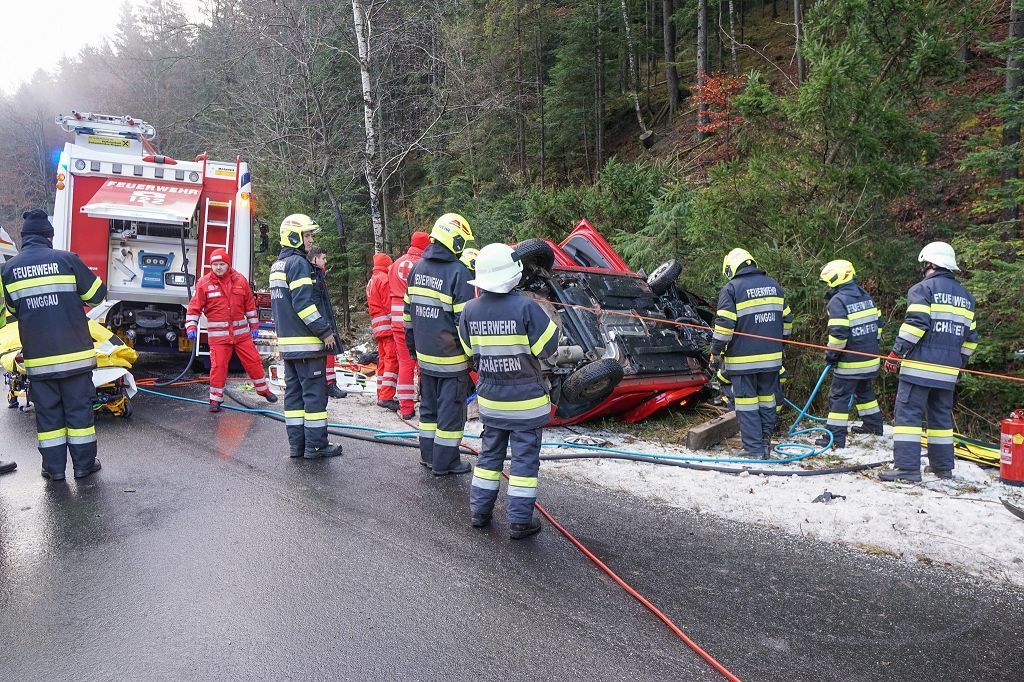 Zu einem schweren Verkehrsunfall ist es am Freitagmorgen (15.12.2023) auf der L423 im steirisch – niederösterreichischen Grenzgebiet bei Schäffern gekommen. Auf der durch Regen glatten Fahrbahn kam eine Lenkerin mit ihrem Pkw von der Straße ab, überschlug sich und kam seitlich zwischen Fahrbahn und Bachbett zu liegen. Die Lenkerin, welche sich allein im Fahrzeug befand wurde eingeklemmt. Nach der Erstversorgung durch zwei Notärzte wurde die Frau von den Feuerwehren Schäffern und Pinggau mittels Hydraulischen Rettungssatz aus dem Wageninneren befreit und mit Verletzungen unbestimmten Grades vom NAH C16 ins Krankenhaus Oberwart geflogen. Nach der polizeilichen Freigabe wurde das schwer beschädigte Unfallfahrzeug mittels WLF – Kran der FF Pinggau geborgen und von der Unfallstelle verbracht. Der Einsatz konnte nach rund 2 Stunden beendet werden.