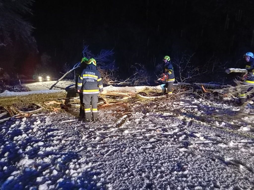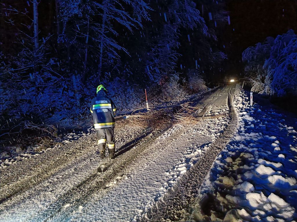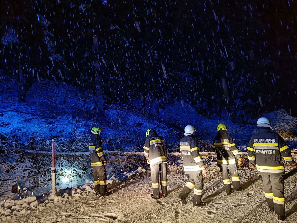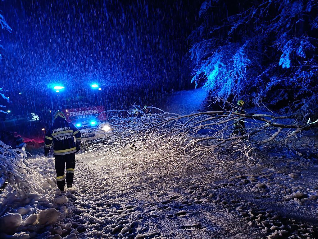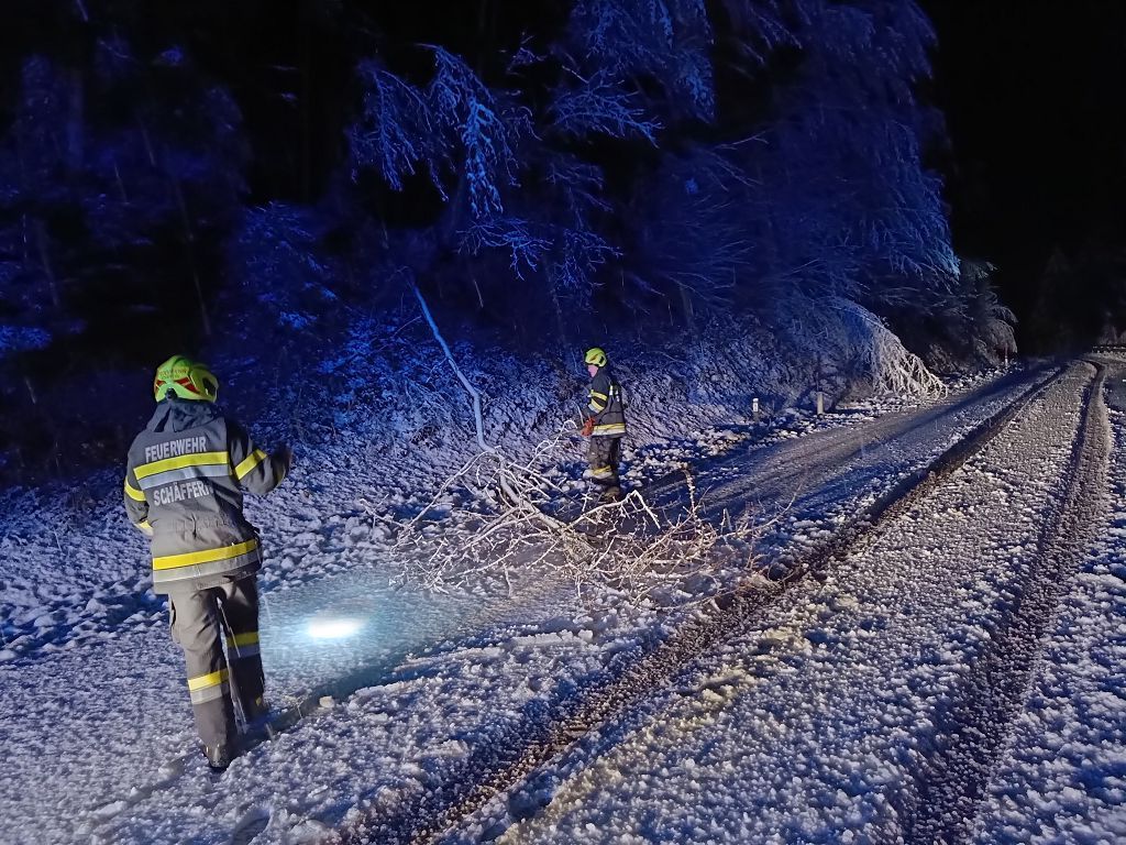 Aufgrund der schweren Schneelasten stürzten immer wieder Bäume auf die Straße und sorgten für weitere Einsätze für die FF Schäffern. So wurden wir um 02:46 Uhr sowie 04:53 Uhr zu mehreren Baumbergungen auf der L424 alarmiert. Während die Schadenslagen abgearbeitet wurden, erhielten wir die Info über weitere umgestürzte Bäume, welche die Straßen blockierten. Die Bäume wurden mit Hilfe von Motorkettensägen entfernt und die Straßen gesäubert.