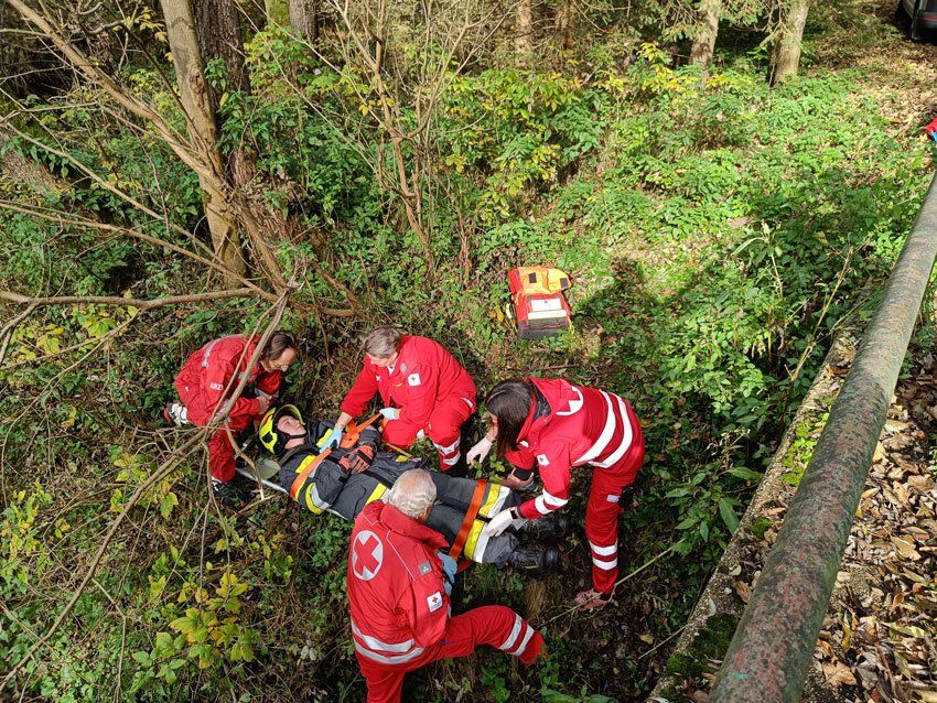 Während der Brandbekämpfung wurde an der Saugstelle ein medizinischer Notfall eines Kameraden simuliert. Das ebenfalls im Übungs-Einsatz befindliche Team des Roten Kreuzes und Abschnittsfeuerwehrarzt Dr. Winfried Koller hatten die Lage rasch gemeistert und den verunfallten Kameraden gerettet.